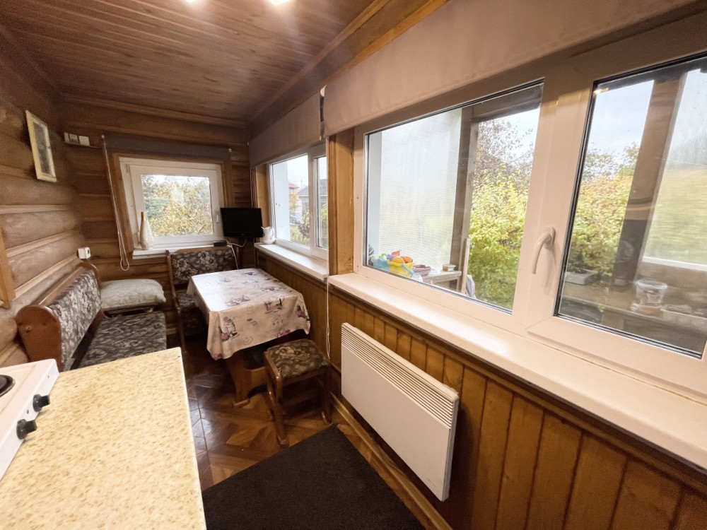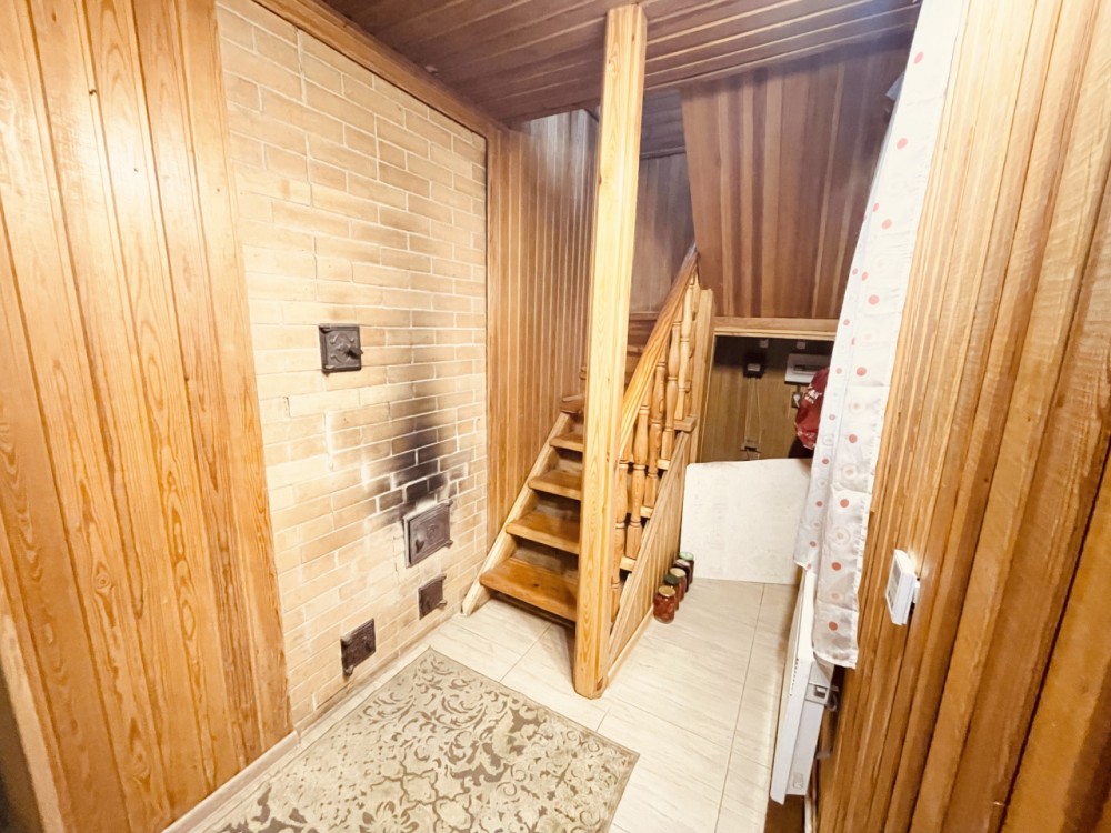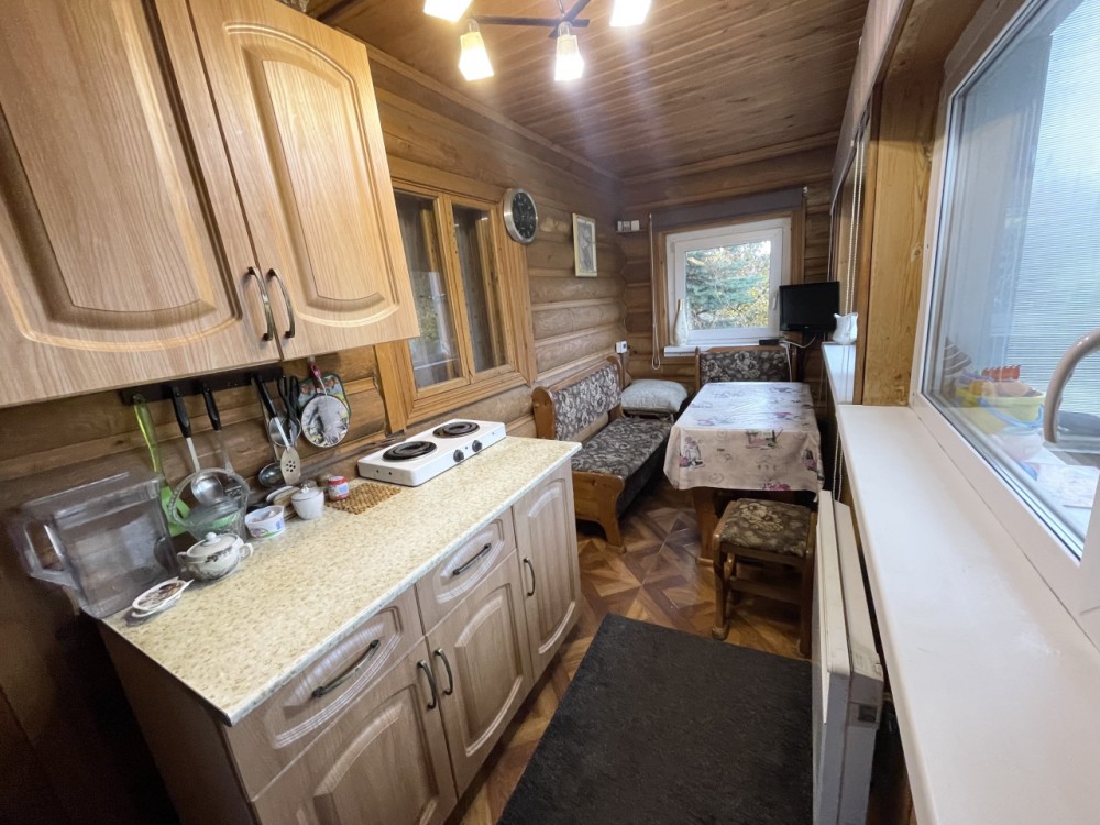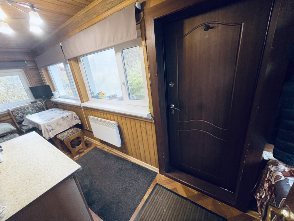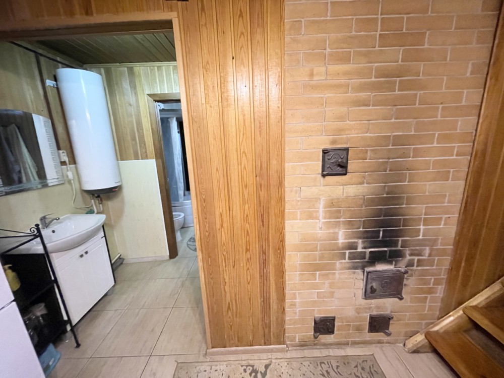 Дом пригоден для круглогодичного проживания. Фундамент ленточный, материал стен - оцилиндрованное бревно. Дом утеплен, стекловата 100, гидроизоляция, внешняя сторона - металлосайдинг с фактурой дерева.Первый этаж - крыльцо, прихожая, кухня, проходная с лестницей на второй этаж, кладовка, ванная комната с душевой кабиной, сауна-парилка. На втором этаже - просторная комната, поделенная на две зоны - гостиную и спальню. Из коммуникаций: установлена кирпичная печь, так же сауну разогреть можно электрической печкой (на 380В). В зимнее время года дом отапливается электрическими радиаторами (4 шт.), в доме сделана разводка холодной и горячей воды, есть водонагреватель, унитаз, душевая кабина, раковина с тумбой, теплый пол на первом этаже. Имеется собственная скважина 50 метров, год назад поменяны насос и гидроаккумулятор.
