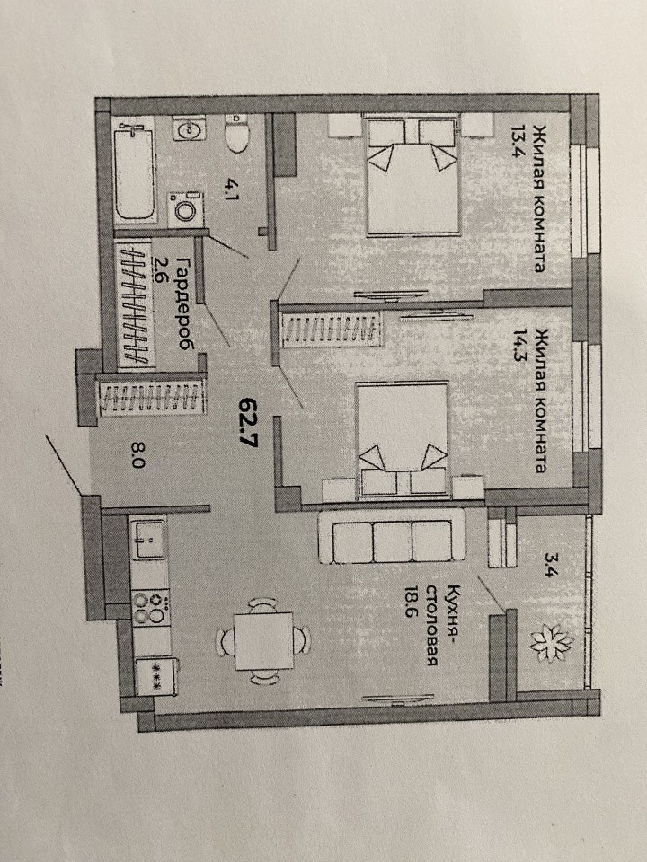 Площадь (общая/жилая/кухни) 60.2/27.7/18.6 кв. м